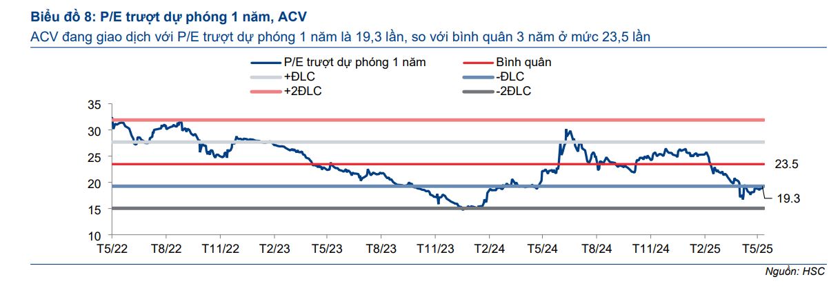 - Vị thế độc quyền và triển vọng dài hạn: HSC ưa thích ACV nhờ vị thế độc quyền, triển vọng dài hạn vững chắc từ các dự án lớn như T3 Tân Sơn Nhất (vận hành T4/2025) và LTIA (khả năng hoạt động từ 2026), hưởng lợi từ nhu cầu du lịch quốc tế tăng mạnh.