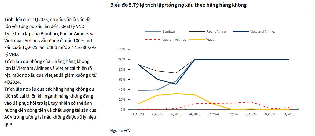 - Vấn đề nợ xấu: Nợ xấu vẫn là vấn đề lớn với tổng số 5,863 tỷ VND tại cuối Quý 1/2025, chủ yếu từ Bamboo, Pacific Airlines và Viettravel Airlines (trích lập 100%). Tuy nhiên, trích lập dự phòng từ Vietnam Airlines và Vietjet đã cải thiện. KBSV kỳ vọng nợ xấu sẽ cải thiện khi ngành hàng không phục hồi nhưng vẫn có thể ảnh hưởng đến dòng tiền và chất lượng tài sản nếu không xử lý hiệu quả.