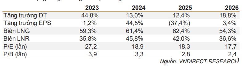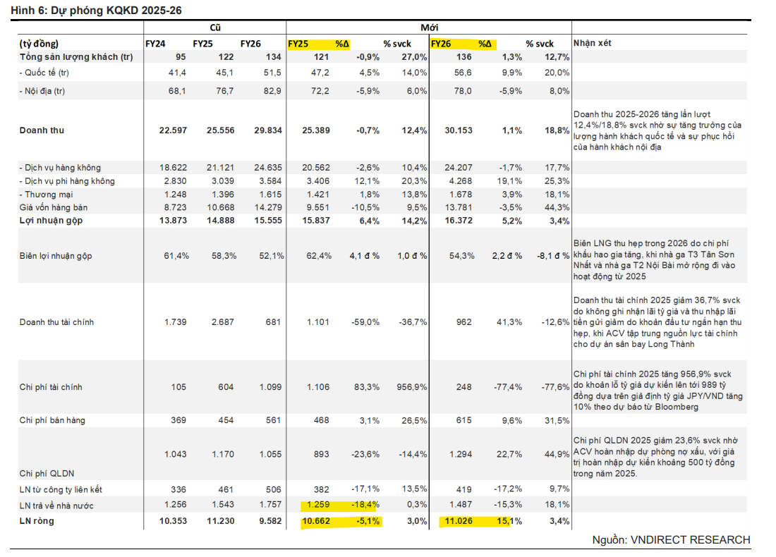 - Dự báo lợi nhuận: Lợi nhuận thuần dự báo tăng 13% (11,600 tỷ đồng) năm 2025 và 12% (13 nghìn tỷ đồng) năm 2026. Tuy nhiên, lợi nhuận thuần dự báo giảm 34% trong năm 2027 do chi phí khấu hao và lãi vay tăng trong giai đoạn đầu vận hành Cảng HKQT Long Thành (LTIA), dù EBITDA vẫn tăng trưởng mạnh 20% CAGR trong 3 năm.