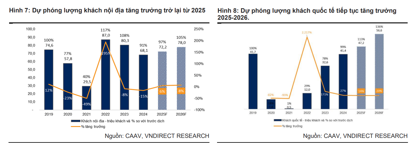 - Tăng trưởng lưu lượng hành khách: Doanh thu được kỳ vọng tăng 12.4%/18.8% trong năm 2025-2026, đạt lần lượt 25,389 tỷ đồng và 30,153 tỷ đồng. Lượng khách quốc tế dự kiến tăng 14%/20% trong 2025-2026, nhờ sự phục hồi từ Trung Quốc, Nga và các thị trường trọng điểm khác. Lượng khách nội địa cũng dần phục hồi nhờ kích cầu du lịch và giá vé hợp lý.