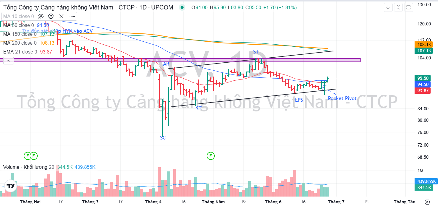 Trên đồ thị, ngày 24.6.2025, ACV có điểm mua Pocket Pivot ngay tại đường trendline bên dưới.