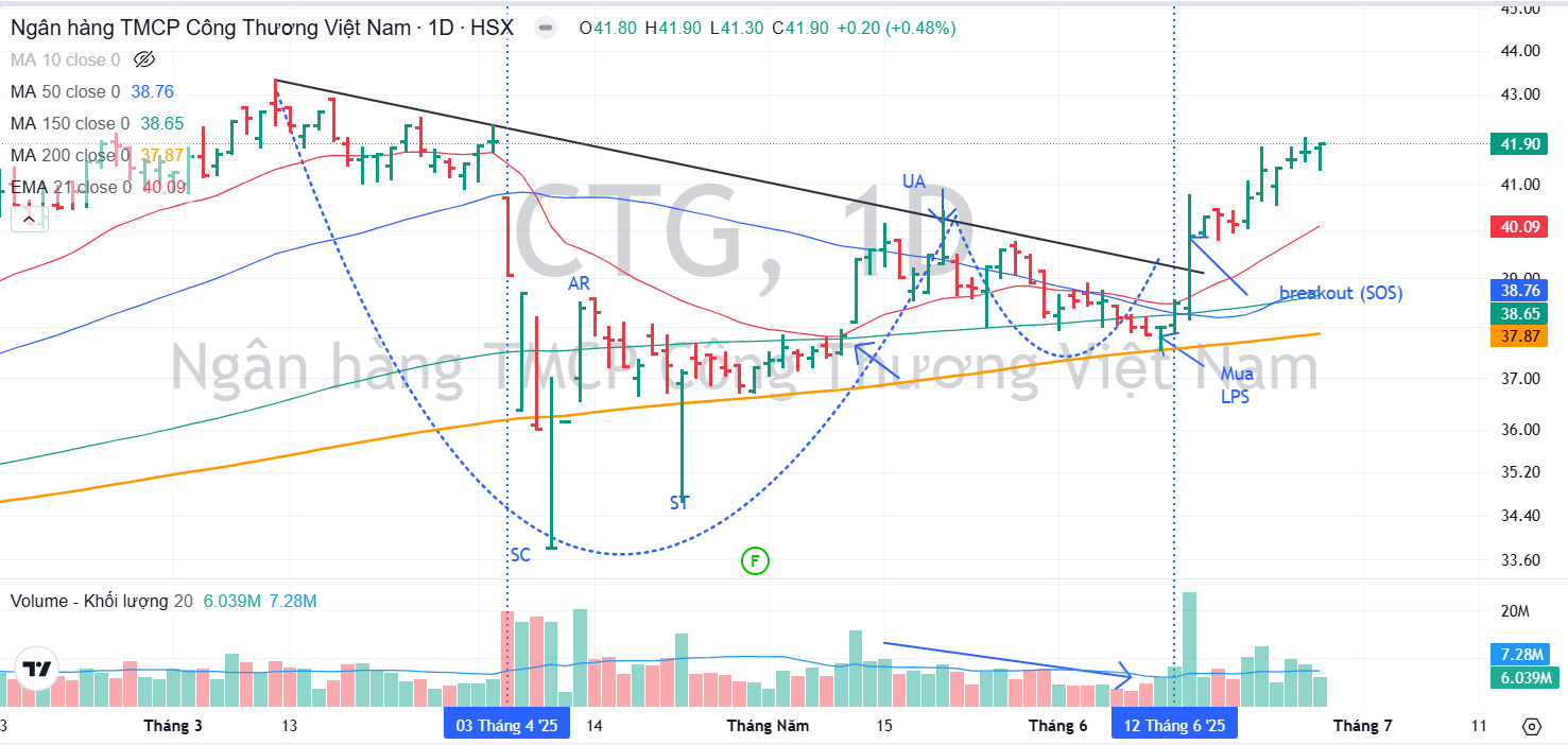 Sau điểm mua breakout ngày 13.6.2025, cổ phiếu CTG vẫn đang duy trì đà tăng giá.