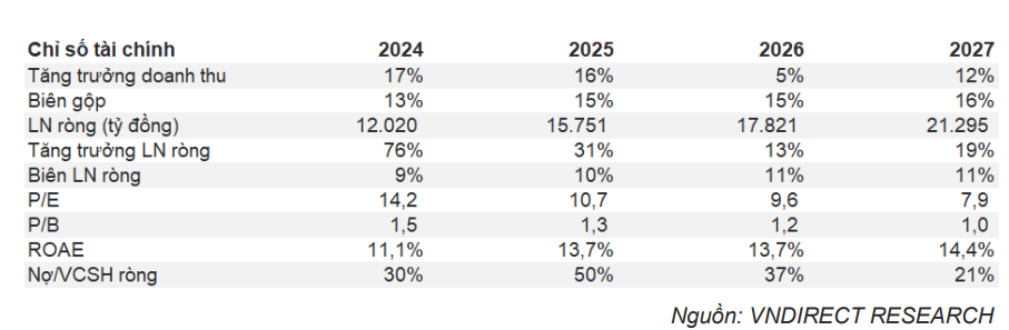 HPG đang giao dịch ở mức P/B 1.3 (2025) và 1.2 (2026) với ROE dự phóng 14% (thấp hơn giai đoạn 2015-2022). P/E ở mức 10.7 (2025) và 9.6 (2026) được xem là hợp lý. Tuy nhiên, VNDirect cho rằng dư địa mở rộng định giá trong nửa cuối 2025 là hạn chế do EV/EBITDA đã tiệm cận vùng đỉnh chu kỳ trước.