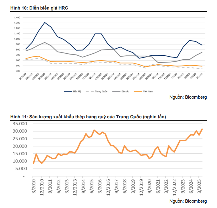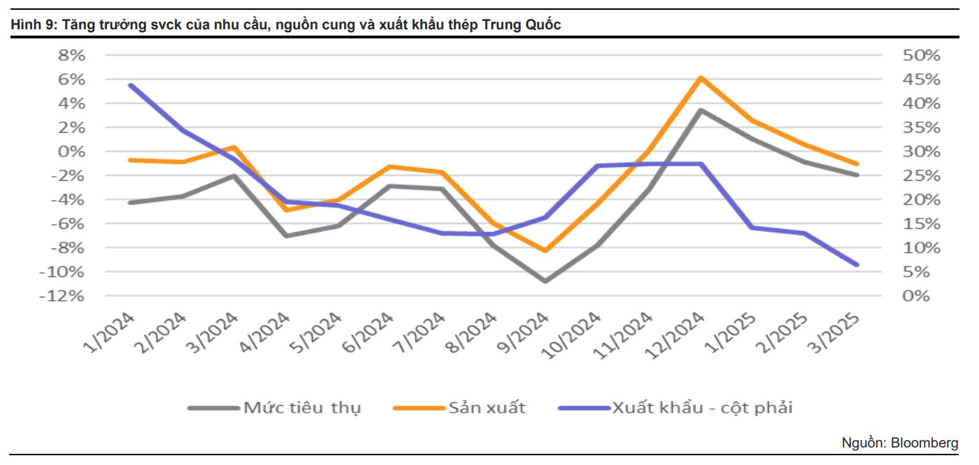 - Ngành thép toàn cầu vẫn khó khăn: VNDirect nhận định giá thép Trung Quốc tiếp tục chịu áp lực do nguồn cung giảm chậm hơn nhu cầu suy yếu. Xu hướng này dự kiến không thay đổi ít nhất trong nửa cuối năm 2025 do thiếu động lực cắt giảm sản lượng mạnh từ cả Chính phủ lẫn khu vực tư nhân.