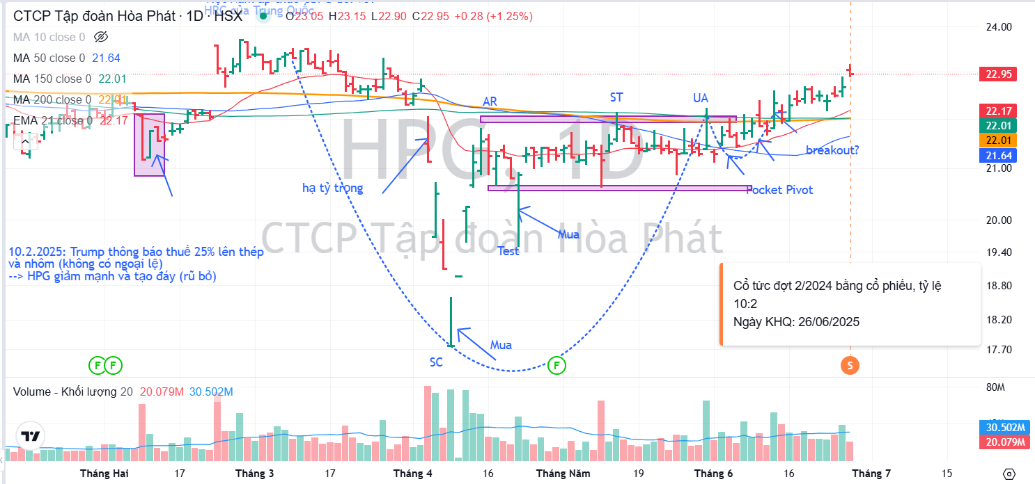 Ngày 26.6.2025 là ngày giao dịch không hưởng quyền chi trả cổ tức cổ phiếu tỷ lệ 20% của HPG. Điều này gỡ bỏ áp lực sợ kẹp cổ phiếu. HPG tăng giá nhẹ +1.3% vào lúc 10h20 phút ngày 26.6.2025.