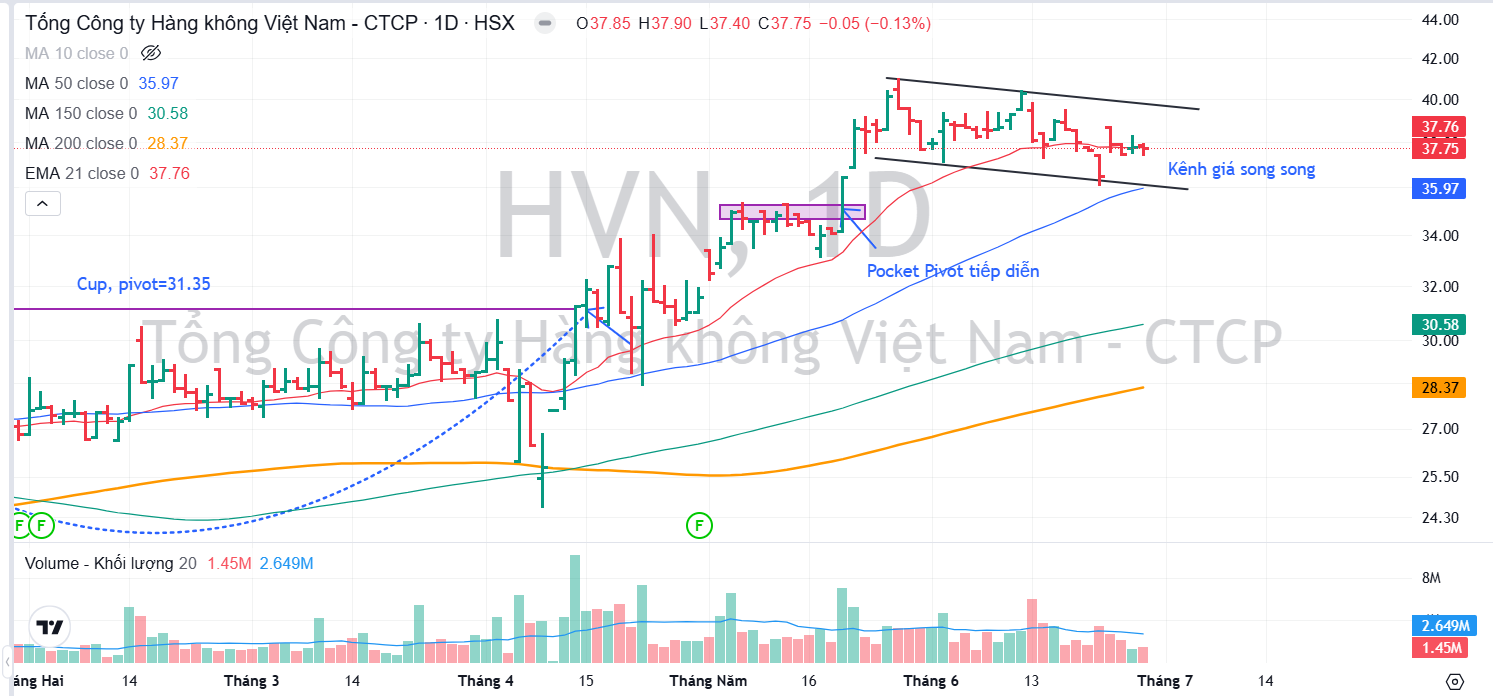 Trên đồ thị, HVN đang hình thành kênh giá song song, tích luỹ quanh EMA 21 ngày để xây nền giá nhỏ.