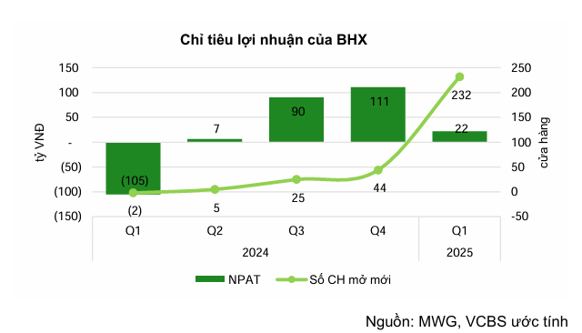 - BHX tăng trưởng lợi nhuận từ Q2/2025: BHX kỳ vọng ghi nhận lợi nhuận tích cực từ quý 2/2025 sau khi hoàn tất gần 90% kế hoạch mở mới trong năm. Dù chịu áp lực chi phí đầu tư, Q1/2025 BHX vẫn đạt 22 tỷ đồng LNTT, với hầu hết cửa hàng mới đã có lãi ở cấp độ cửa hàng. VCBS kỳ vọng BHX đạt khoảng 120 tỷ đồng lợi nhuận ròng mỗi quý từ Q2 trở đi.