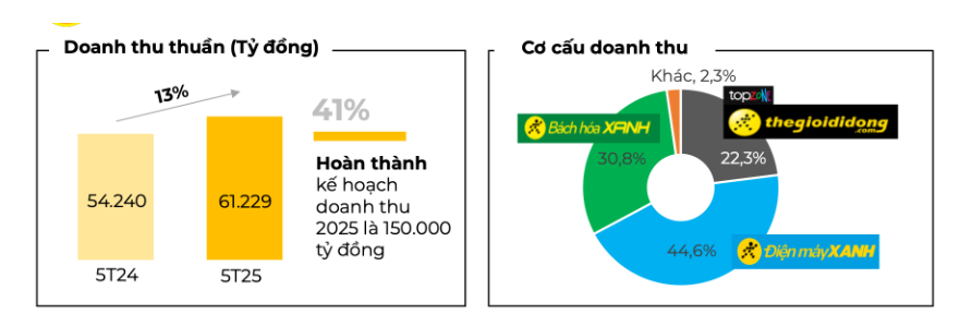 Lũy kế 5 tháng đầu năm 2025, toàn bộ hệ sinh thái MWG đạt doanh thu thuần 61,200 tỷ đồng, tăng 13% so với cùng kỳ năm trước, hoàn thành 41% kế hoạch doanh thu năm 2025 (150,000 tỷ đồng).