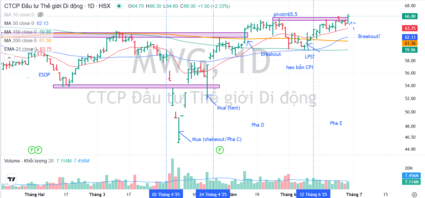 Trên đồ thị, MWG hướng tới điểm breakout vượt qua điểm mua 65,500 đồng vào ngày 27.6.2025 khi tăng +2% (tính tới lúc đóng cửa phiên sáng). Thanh khoản tăng tốt đáp ứng cho tiêu chí ngày breakout.