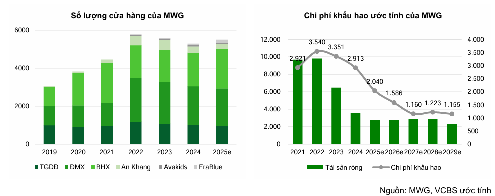- Giảm áp lực chi phí khấu hao từ 2025: Khoảng 800 cửa hàng dự kiến hoàn tất chu kỳ khấu hao trong năm 2025, giúp MWG tiết kiệm 900 tỷ đồng chi phí, cải thiện biên lợi nhuận.