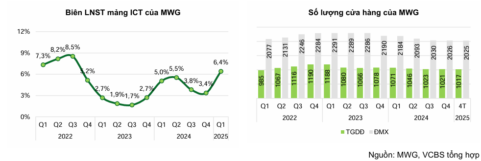 - Tiết giảm chi phí hoạt động sau tái cấu trúc ICT: Chính sách khấu trừ thuế trực tiếp trên các sàn TMĐT khiến nhiều shop cá nhân rút lui, tạo cơ hội cho TGDĐ và ĐMX mở rộng thị phần online. Biên lợi nhuận ròng Q1/2025 đạt 6.4% nhờ tối ưu vận hành và cạnh tranh giá giảm nhiệt.
