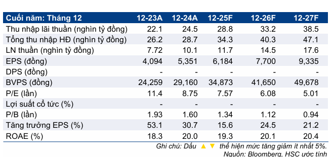 - Chi phí tín dụng giảm: Dự kiến giảm 10 điểm cơ bản xuống 0.28% năm 2025 và tiếp tục xuống 0.23% năm 2026.