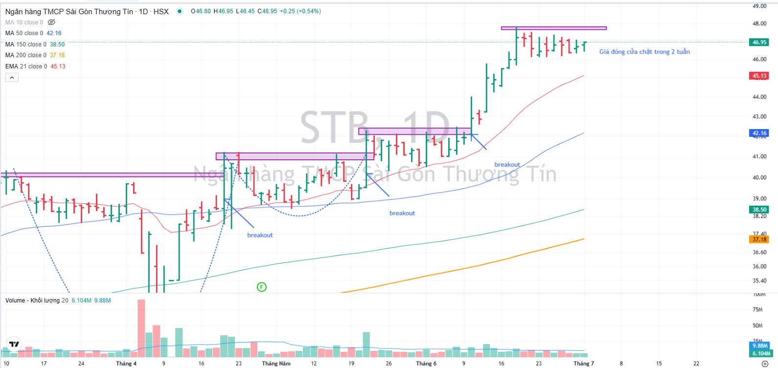 Trên đồ thị, STB đã rời xa nền giá và hiện đang tích luỹ chặt trong 2 tuần. STB không còn điểm mua