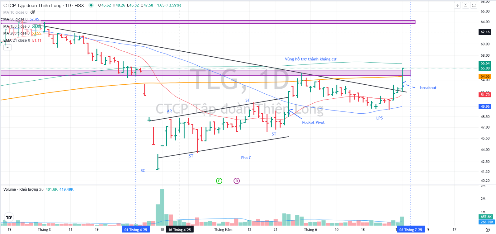 Trên đồ thị, TLG có điểm breakout vào ngày 1.7.2025, thoát khỏi đường trendline giảm giá. Trước đó, TLG có điểm mua Pocket Pivot vào ngày 26.5.2025