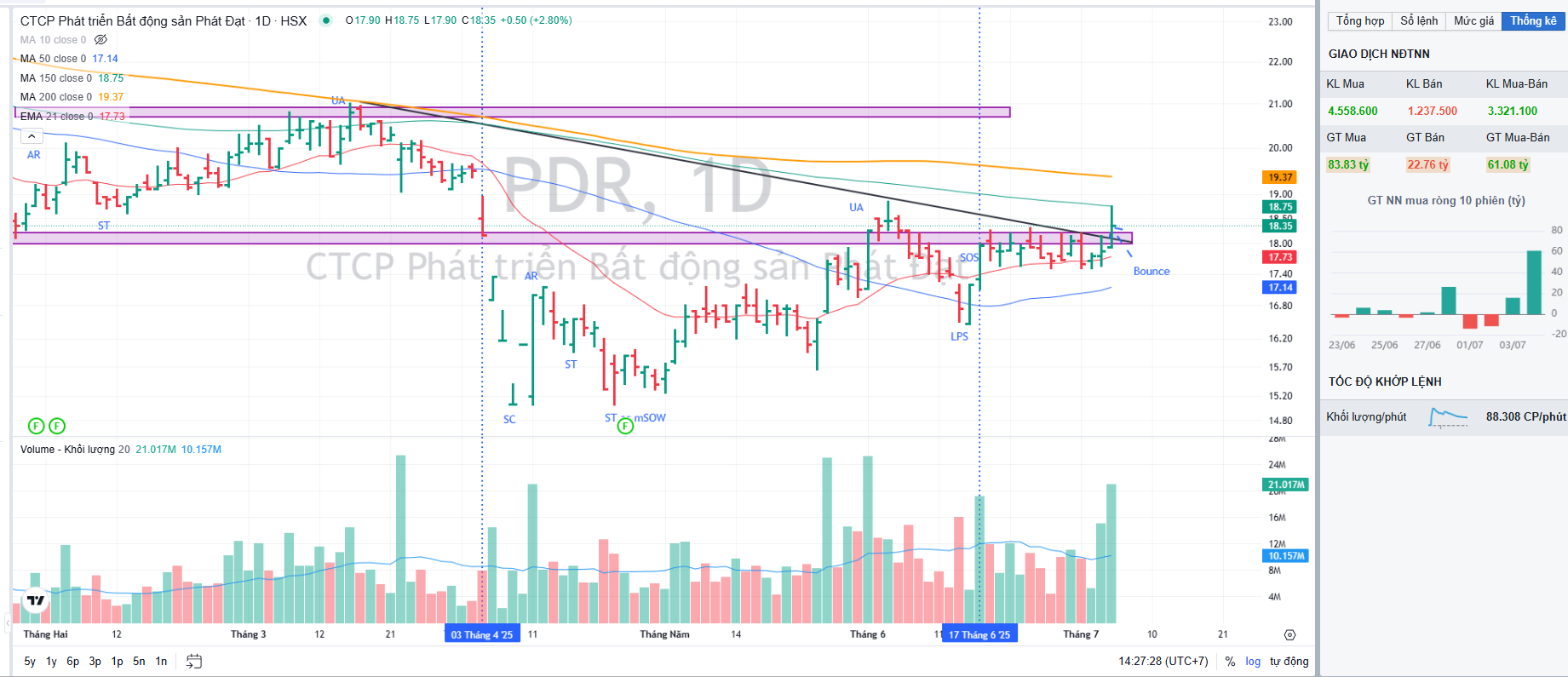 Trên đồ thị, RS của PDR là 26, hoạt động yếu so với các cổ phiếu bất động sản trong ngành và toàn thị trường. Ngày 4.7.2025, PDR bật nảy từ EMA 21 ngày với thanh khoản lớn khi dòng tiền đổ vào nhóm bất động sản.