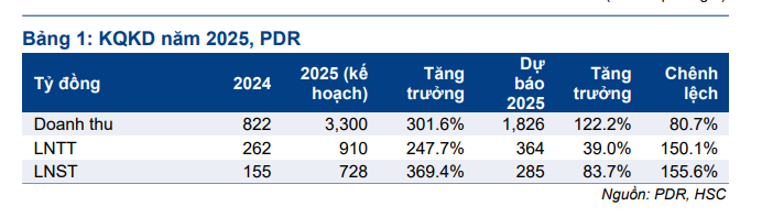 Tại ĐHCĐ, PDR đã đặt mục tiêu LNST năm 2025 lên tới 728 tỷ đồng (tăng trưởng 5 lần so với năm trước) trên doanh thu 3,300 tỷ đồng (tăng trưởng 4 lần). Kế hoạch lợi nhuận này cao hơn tới 155.6% so với dự báo 285 tỷ đồng của HSC.