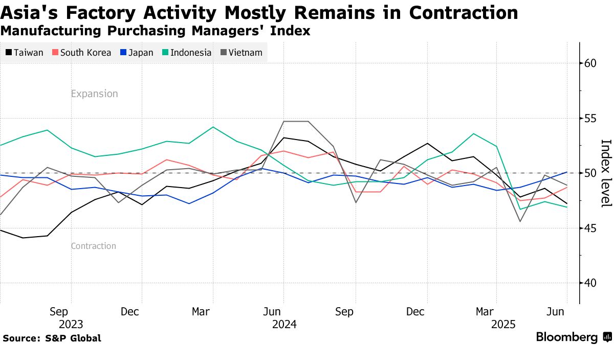 Sự chậm lại trong hoạt động sản xuất của Châu Á tiếp tục sâu sắc hơn vào tháng 6, một dấu hiệu cảnh báo cho triển vọng tăng trưởng của khu vực khi thuế quan đối với các lô hàng đến Hoa Kỳ sắp tăng vào tuần tới. Các nền kinh tế phụ thuộc vào xuất khẩu bao gồm Đài Loan và Việt Nam chứng kiến chỉ số quản lý mua hàng của họ tiếp tục xấu đi, với các nhà máy báo cáo rằng đơn đặt hàng mới, sản lượng và nhân sự tiếp tục giảm khi chiến tranh thương mại làm giảm nhu cầu.