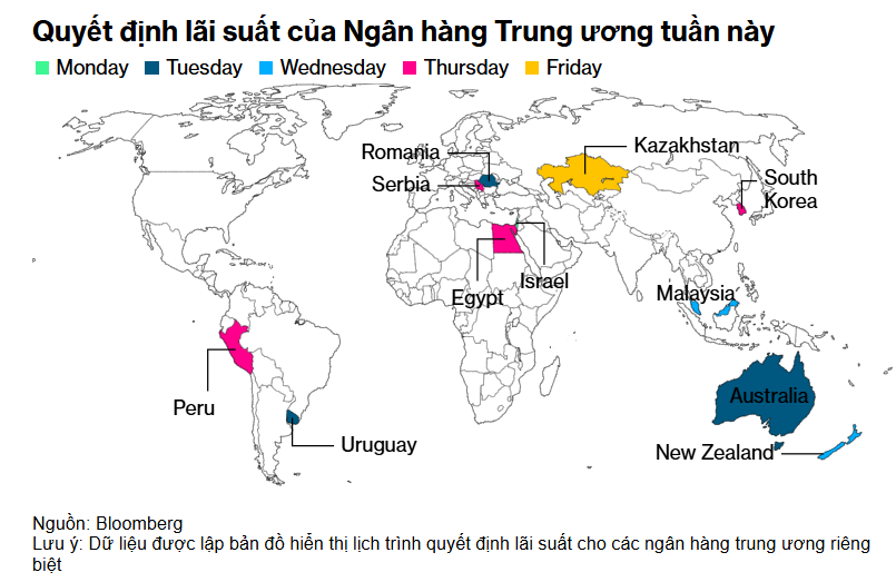 Lưu ý: Dữ liệu được lập bản đồ hiển thị lịch trình quyết định lãi suất cho các ngân hàng trung ương riêng biệt