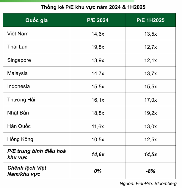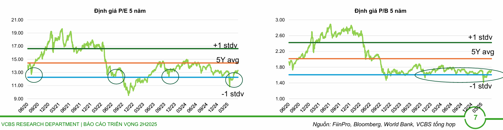 Theo VCBS, kể từ đầu năm 2025, VN-Index vẫn đang giao dịch ở mức P/E 13.3x, khá thấp so với bình quân khu vực (~15x) và bình quân 5 năm (~14.4x).