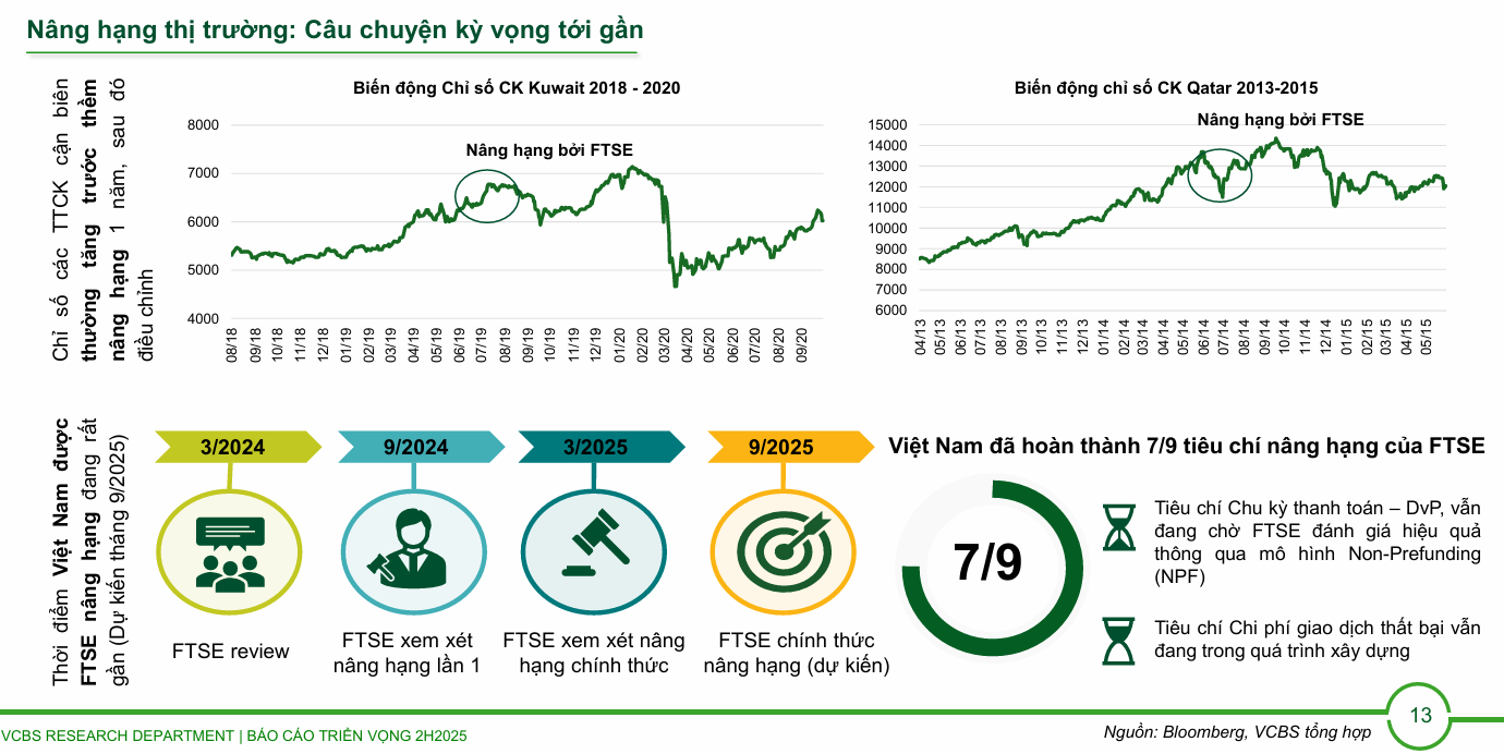 - Nâng hạng thị trường: Được FTSE nâng hạng lên Emerging Market, TTCK Việt Nam có thể đón dòng tiền khối ngoại ròng lên tới 1.3– 1.5 tỷ USD trong Quý III/2025 (bao gồm 950 triệu USD từ các quỹ ETF thụ động mô phỏng theo rổ chỉ số FTSE Emerging Markets Index).