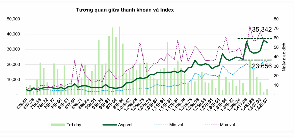 - Dự báo Thanh khoản: Thanh khoản bình quân được dự báo có thể đạt 27,000 – 29,000 tỷ đồng/phiên. Nếu Index gia tăng, thanh khoản bình quân có thể tăng lên ít nhất là 26,000 tỷ đồng/phiên.