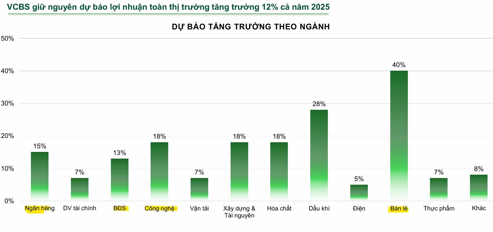 - Ngân hàng: Tăng trưởng tín dụng kỳ vọng đạt 16% vào cuối năm 2025, NIM tạo đáy, nợ xấu giảm dần. Định giá toàn ngành hấp dẫn trên nền tăng trưởng.