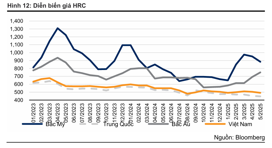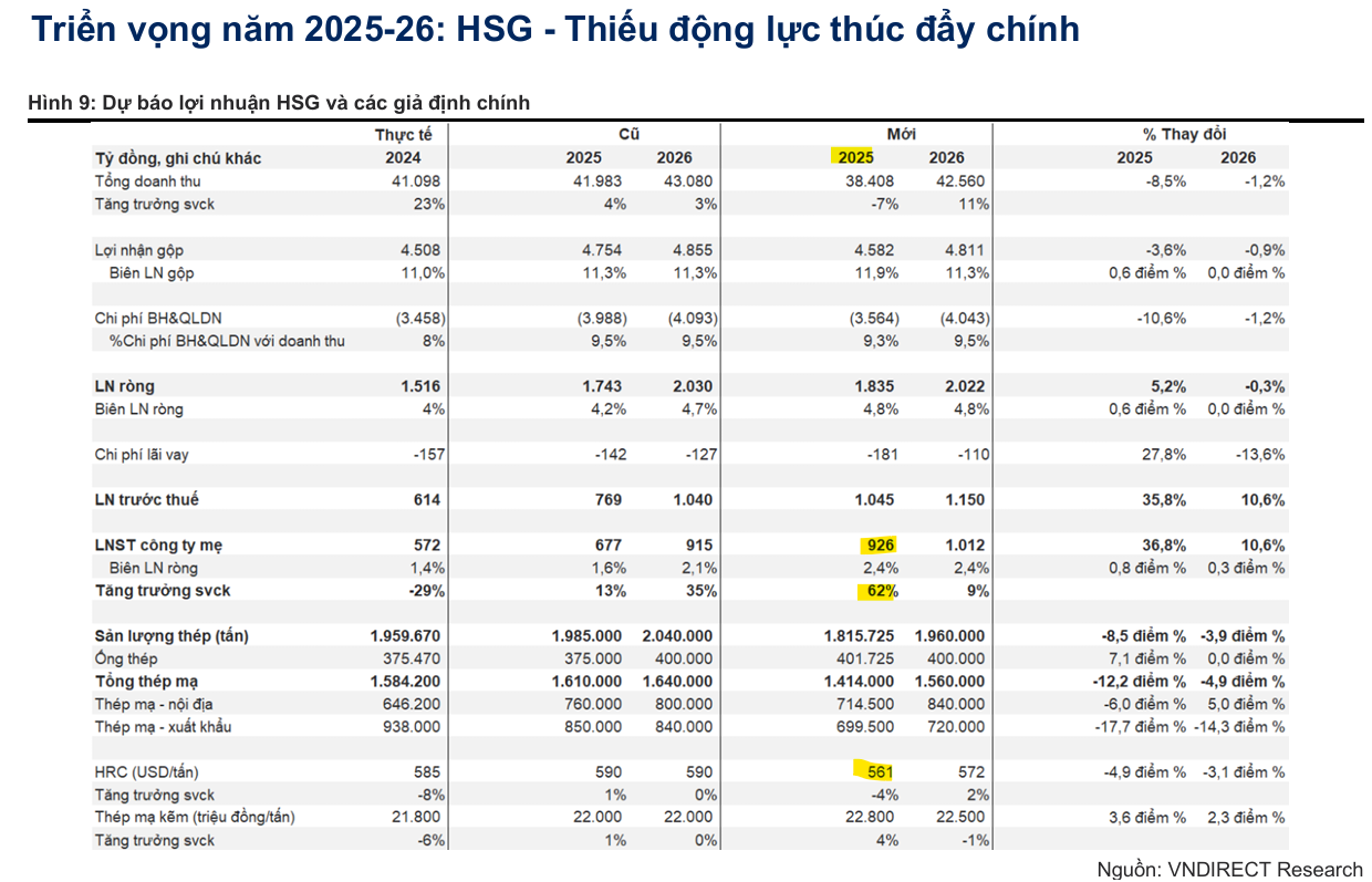 - Áp lực giá thép và sản lượng: Giá thép Trung Quốc tiếp tục chịu áp lực do cắt giảm sản lượng chậm và nhu cầu yếu. VNDirect dự phóng sản lượng bán hàng của HSG sẽ giảm 7% trong năm 2025, chủ yếu do xuất khẩu giảm 25% khi HSG chuyển hướng tiêu thụ trở lại thị trường nội địa để tránh rủi ro điều tra thương mại.