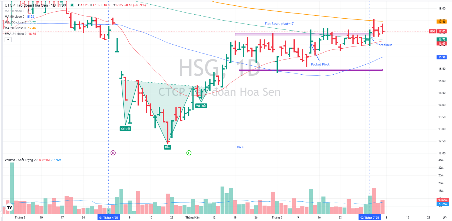Ngày 2.7.2025, HSG breakout Nền Giá Phẳng, vượt qua điểm mua 17,000. Cổ phiếu hiện đang loanh quanh điểm mua