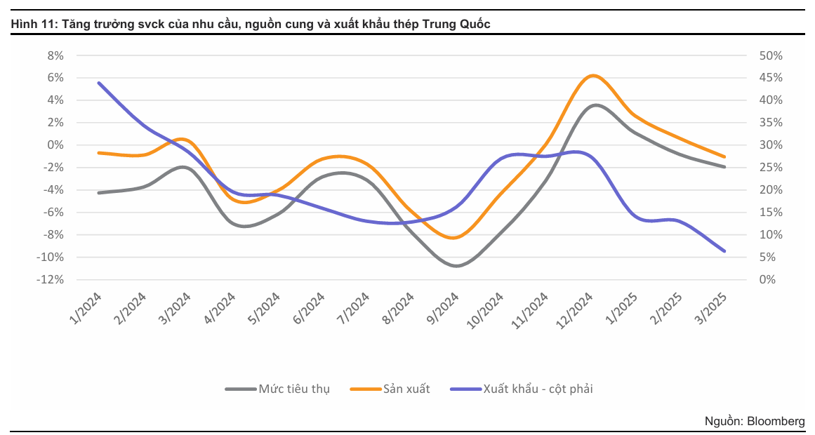 Theo nguồn tin từ Bloomberg, tại Trung Quốc, tăng trưởng svck của sản lượng thép thô/tổng tiêu thụ thép lần lượt đạt -3.0%/-4.3% trong năm 2021, -1.9%/-2.5% năm 2022, +0.6%/-2.6% năm 2023, -1.0%/-3.1% năm 2024 và -1%/-2% trong 3T25. Việc sản lượng thép thô giảm chậm hơn mức suy giảm nhu cầu nội địa đã khiến giá thép liên tục lao dốc kể từ đỉnh năm 2021 đến nay.