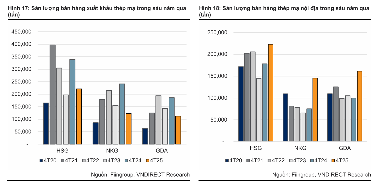 sản lượng bán hàng 4T25 của ba doanh nghiệp thép mạ lớn nhất ghi nhận kết quả kém khả quan hơn svck: toàn ngành giảm 10% svck, sản lượng của HSG giảm 14% svck, NKG giảm 15% svck và GDA giảm 4% svck.