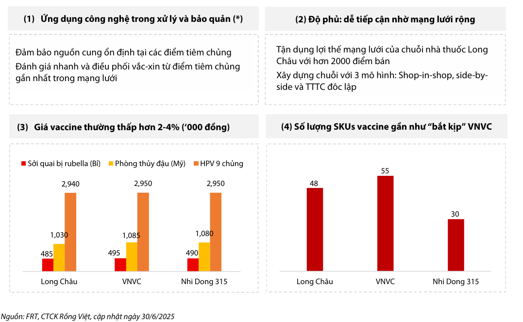 - Ứng dụng công nghệ: Long Châu đang tận dụng AI và hệ thống phần mềm hiện đại để quản lý tồn kho và bán hàng. Điều này giúp đảm bảo nguồn cung vaccine ổn định tại các điểm tiêm chủng, duy trì điều kiện lưu trữ đúng quy định, và cho phép điều phối vaccine nhanh chóng từ điểm gần nhất trong mạng lưới rộng. Với kinh nghiệm trong bán lẻ và năng lực công nghệ, FRT có khả năng dự báo nhu cầu vaccine chính xác để duy trì chuỗi cung ứng ổn định.