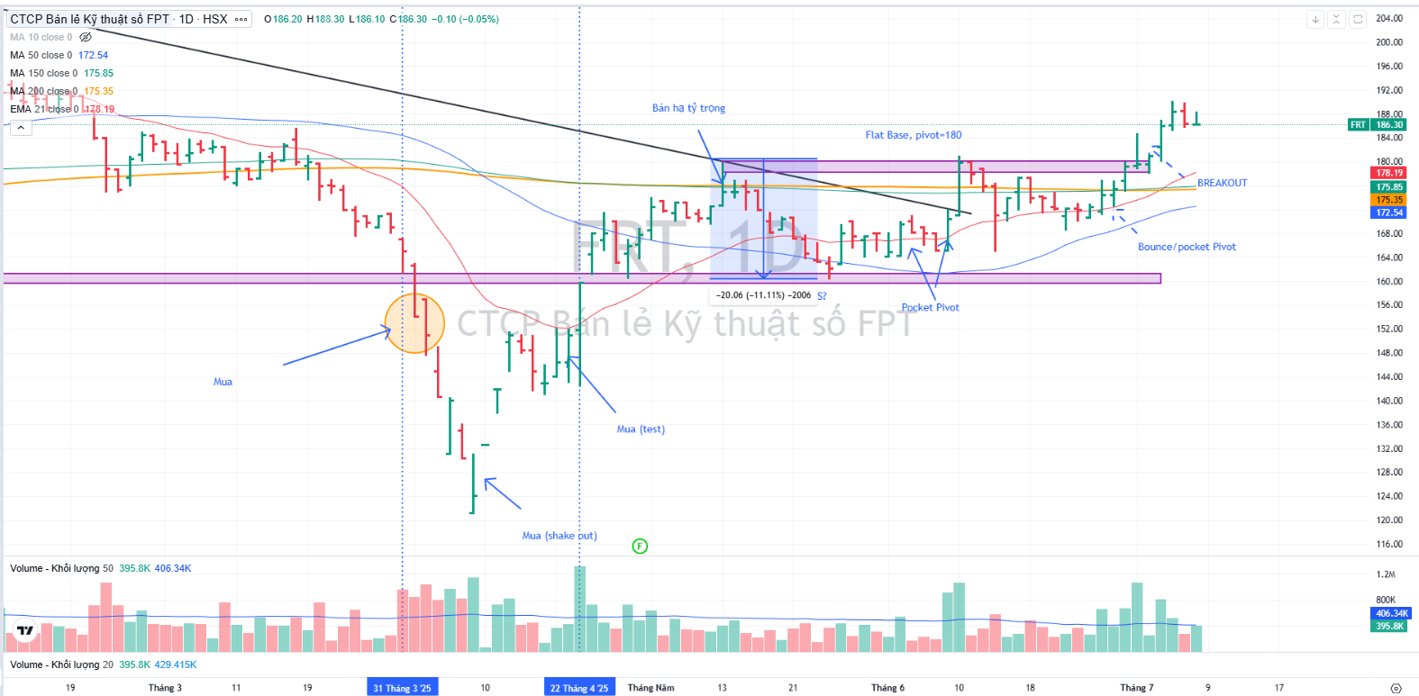 Trên đồ thị, RS của FRT là 88, nằm trong số các cổ phiếu hoạt động khá tốt trên thị trường. Ngày 3.7.2025, FRT breakout mẫu hình Nền Giá Phẳng, vượt qua điểm mua 180,000.