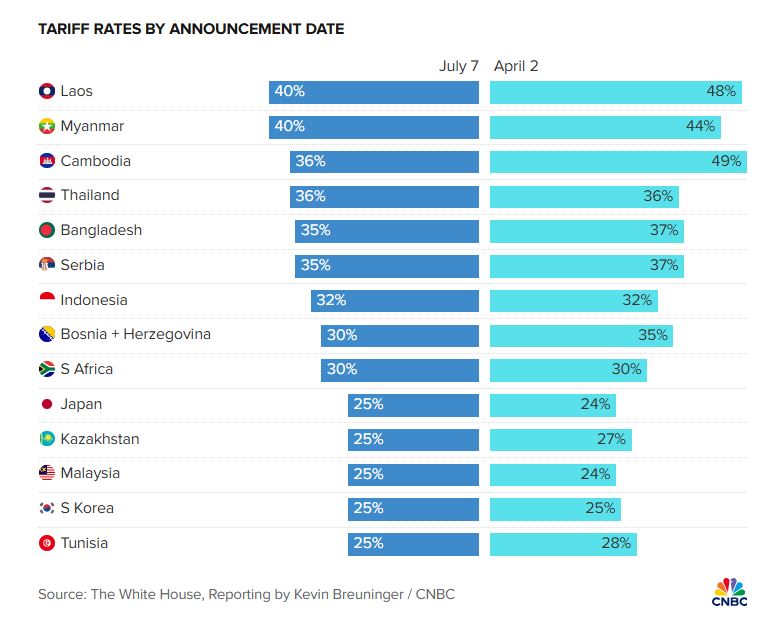 Tổng thống cho biết Hoa Kỳ sẽ áp thuế 25% đối với hàng nhập khẩu từ Nhật Bản và Hàn Quốc. Ông cho biết mức thuế mới đối với cả hai nước sẽ có hiệu lực vào ngày 1 tháng 8 — cung cấp cho các quốc gia thêm thời gian để đạt được thỏa thuận với Hoa Kỳ.