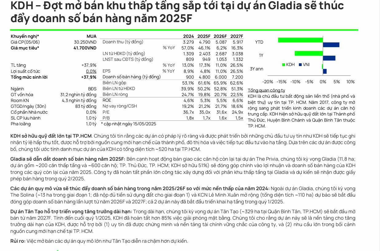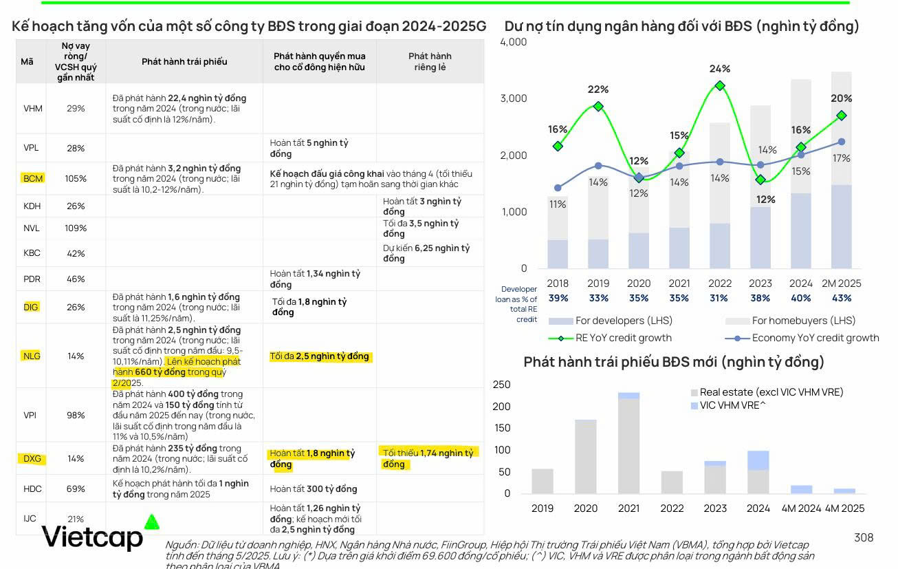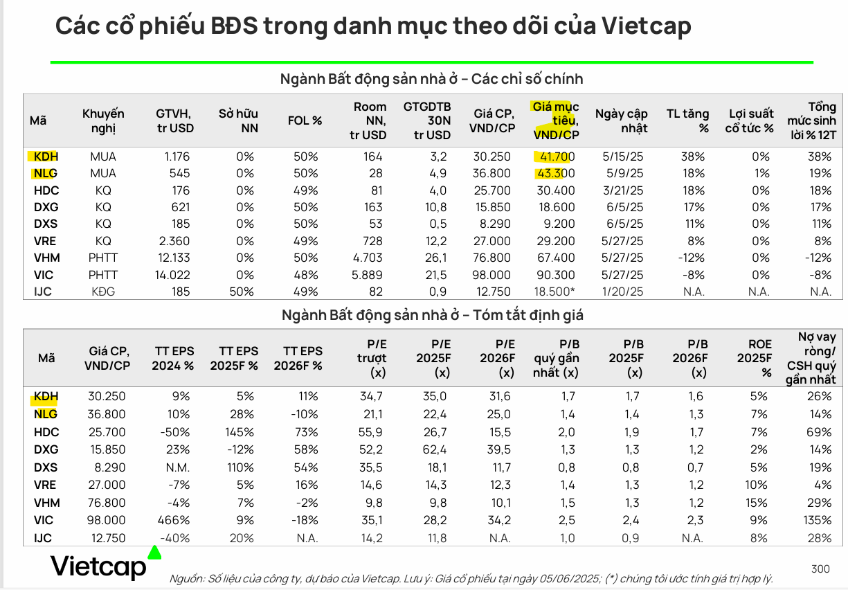 - Dự báo doanh số bán hàng: Vietcap dự báo tăng trưởng doanh số bán hàng trong giai đoạn 2025-2026 đối với các chủ đầu tư BĐS trong danh mục theo dõi. Tổng doanh số bán hàng của KDH, NLG, DXG và HDC dự báo tăng gần 3 lần trong năm 2025, và doanh số bán hàng của VHM dự báo tăng 14% trong năm 2025.4