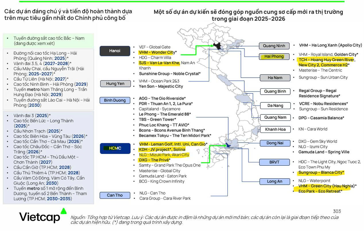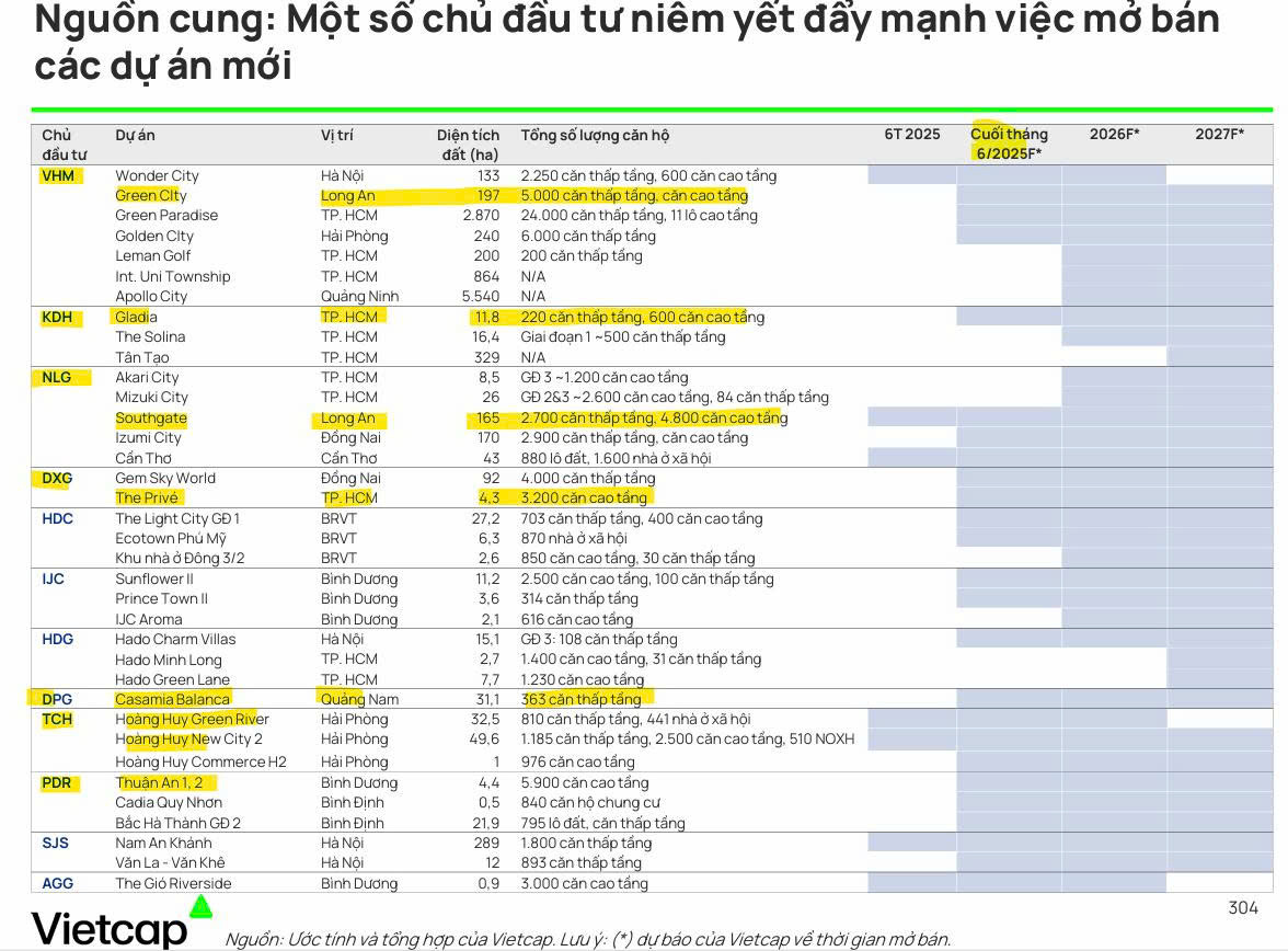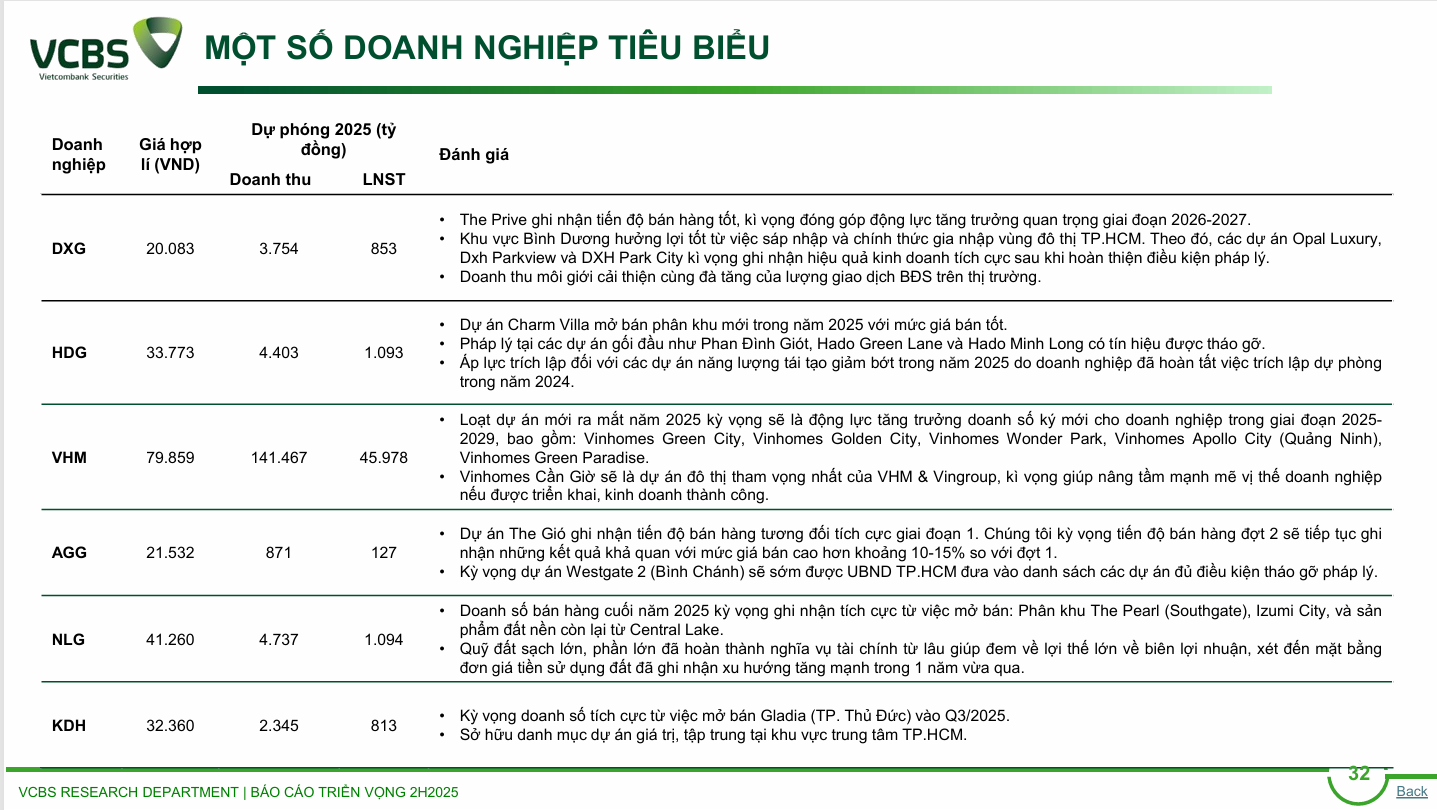 - Phân khúc tiềm năng: VCBS đánh giá cao các chủ đầu tư có dự án sẵn sàng mở bán trong nửa cuối năm 2025. Đặc biệt, các dự án tại khu vực phía Nam được kỳ vọng hưởng lợi rõ nét khi dòng tiền đầu tư dịch chuyển về đây nhờ mặt bằng giá bán hấp dẫn hơn và mức độ quan tâm gia tăng đáng kể tại các địa phương như Bình Dương sau thông tin sáp nhập tỉnh.