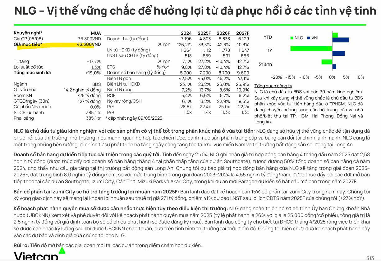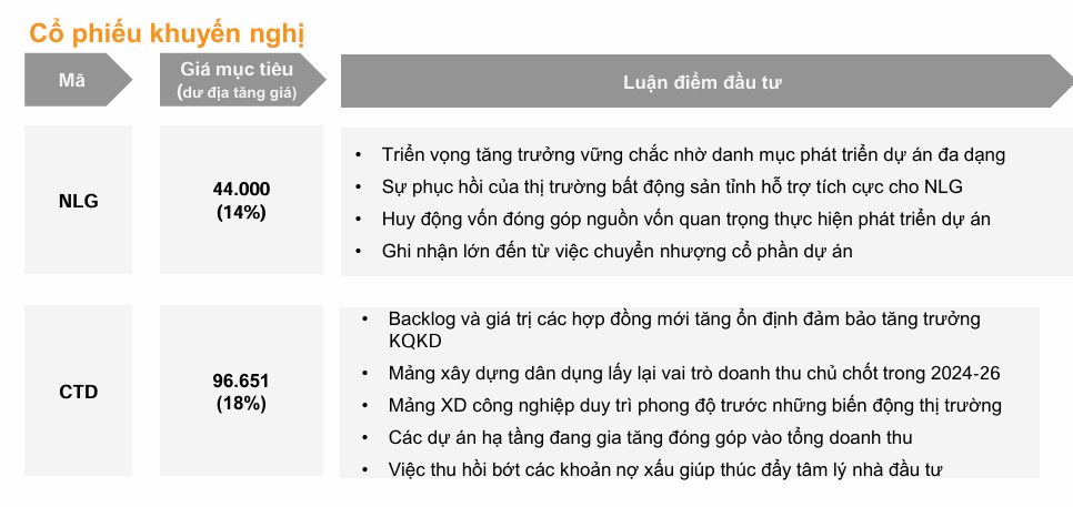 - Cổ phiếu khuyến nghị: NLG với giá mục tiêu 44,000 VND (14% upside). Luận điểm đầu tư bao gồm triển vọng tăng trưởng vững chắc nhờ danh mục dự án đa dạng, sự phục hồi của thị trường BĐS tỉnh, huy động vốn và ghi nhận lớn từ chuyển nhượng cổ phần dự án.