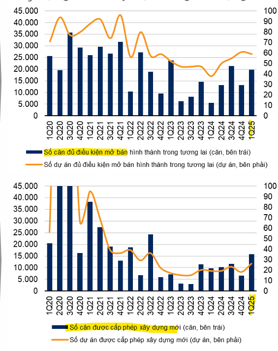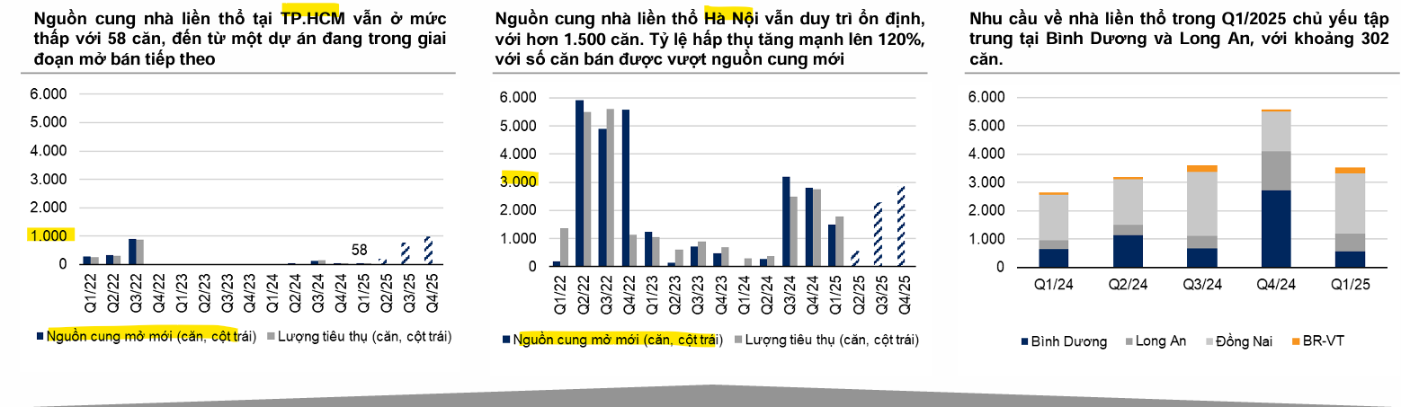 - TP.HCM: Nguồn cung nhà liền thổ vẫn ở mức thấp (58 căn trong Q1/2025), nhưng dự kiến tăng trở lại khoảng 1,000 căn trong năm 2025.