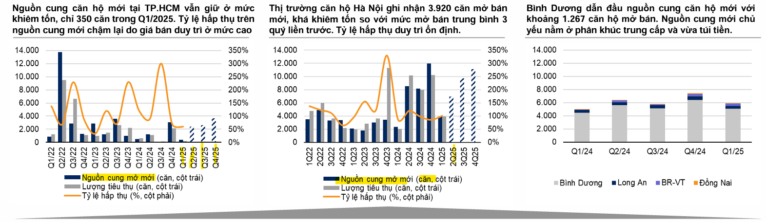 - TP.HCM: Nguồn cung mới vẫn khiêm tốn (350 căn trong Q1/2025), tỷ lệ hấp thụ chậm lại do giá bán duy trì ở mức cao. Dự kiến sẽ có ít hơn 9,000 căn hộ mới được mở bán trong năm 2025.