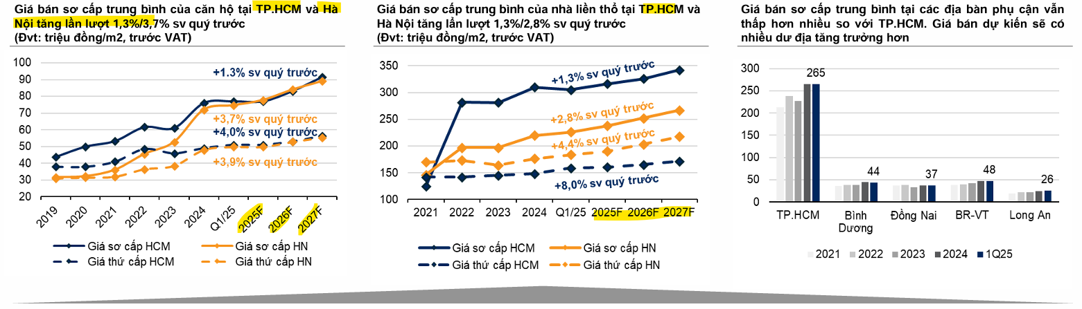 - Giá bán sơ cấp căn hộ tại TP.HCM và Hà Nội dự kiến tăng trung bình 7-9%/năm giai đoạn 2025-2027F.