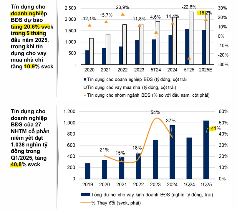 - Tín dụng BĐS: Lãi suất cho vay thả nổi duy trì ổn định, hỗ trợ tín dụng cho doanh nghiệp BĐS. Tín dụng cho doanh nghiệp BĐS của 27 NHTM cổ phần niêm yết tăng 40.8% so với cùng kỳ trong Q1/2025.