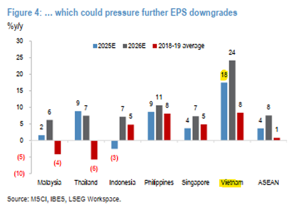 Nâng hạng Việt Nam lên Overweight (OW): J.P. Morgan đã nâng khuyến nghị Việt Nam lên OW trong ASEAN, coi Việt Nam là yếu tố chủ chốt do các yếu tố thuận lợi sau: 1) Thỏa thuận thuế quan với Mỹ tốt hơn kỳ vọng; 2) Chính sách tài khóa đáng kể thúc đẩy tăng trưởng GDP bất chấp rủi ro bên ngoài; 3) Môi trường USD yếu hơn mang lại sự tự do cho ngân hàng trung ương; 4) Giải ngân đầu tư công mạnh mẽ và môi trường pháp lý bất động sản được cải thiện.