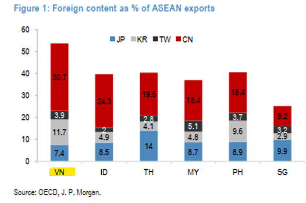 - Dòng vốn FDI và hàm lượng nội địa: J.P. Morgan nhận định rằng hàm lượng nội địa của Trung Quốc trong xuất khẩu của Việt Nam vẫn ở mức cao nhất khu vực (30.7%), điều này làm nổi bật rủi ro rằng một phần đáng kể xuất khẩu của Mỹ có thể phải chịu thuế suất cao hơn.