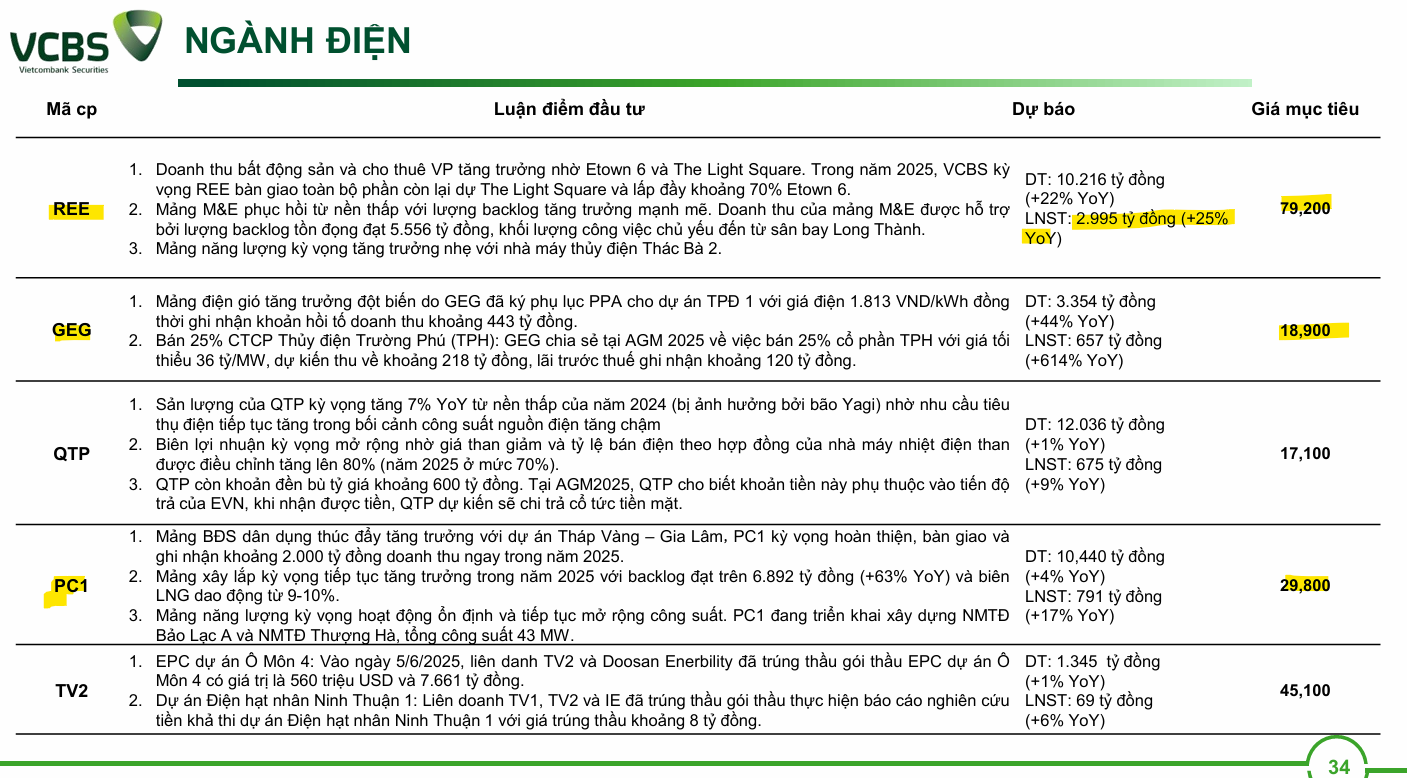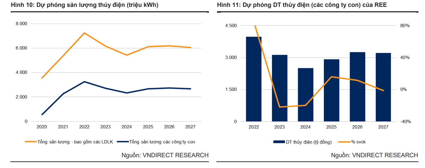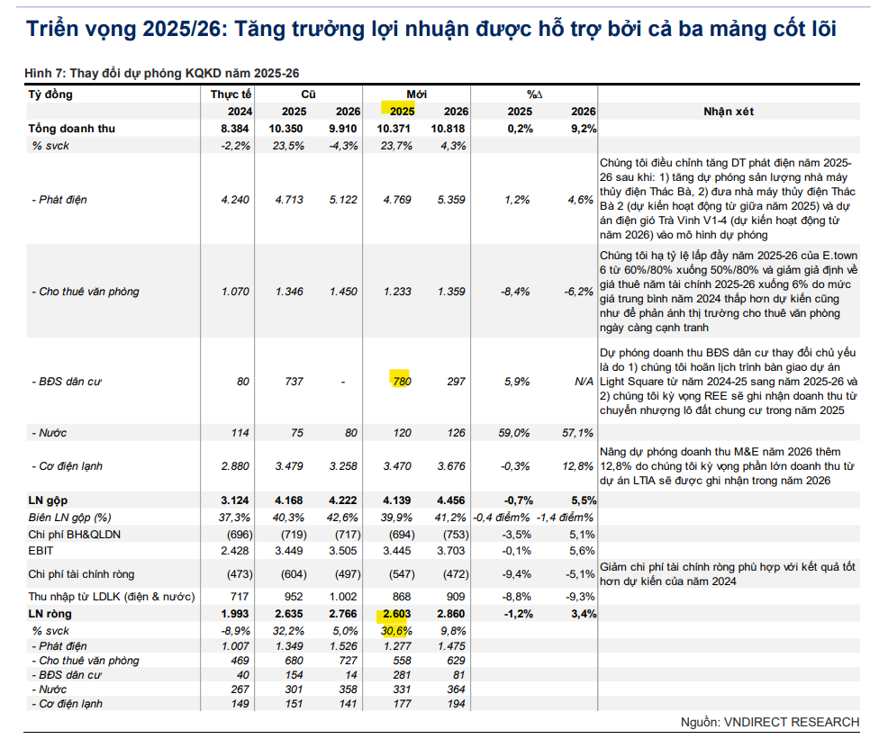 Lợi nhuận ròng Q1/2025 của REE tăng 27% so với cùng kỳ, đạt 611 tỷ đồng, chủ yếu nhờ mức tăng 73.5% lợi nhuận phát điện. VNDirect dự báo doanh thu năm 2025 tăng 23.7% yoy, đạt 10,371 tỷ và lợi nhuận ròng tăng 30.6% yoy, đạt 2,603 tỷ.