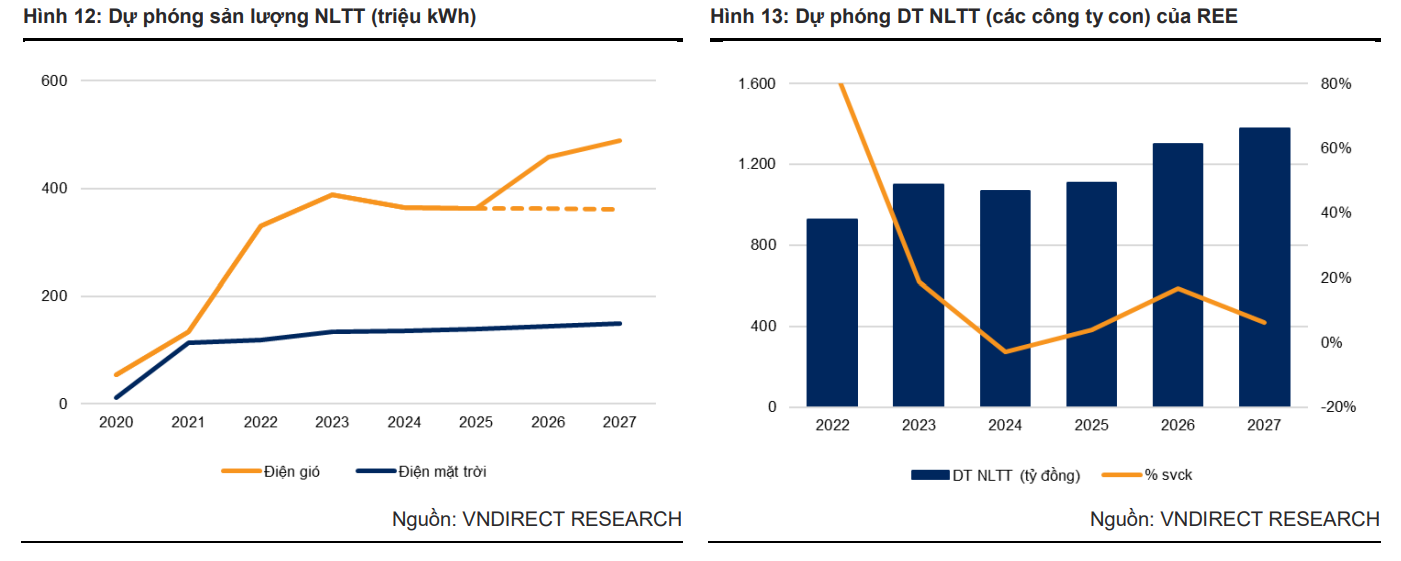 - Tăng trưởng NLTT: KBSV cũng nhấn mạnh REE có dự định đấu thầu các khu đất điện gió tại Trà Vinh (tổng công suất 416 MW) và QHĐ8 Điều chỉnh là bước tiến quan trọng. REE có kế hoạch bổ sung 100 MW trong 2025, 300 MW trong 3 năm tới.