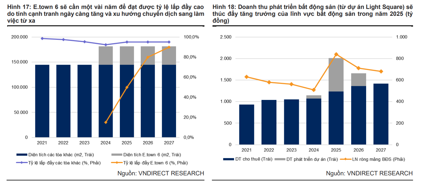 - Bất động sản: Sẽ là động lực tăng trưởng chính của REE vào năm 2025. Tòa nhà văn phòng hạng A E.town 6 kỳ vọng đạt tỷ lệ lấp đầy 50%/80% trong 2025-2026, hỗ trợ doanh thu cho thuê văn phòng tăng 15.3%/10.3%. Việc bán các sản phẩm thấp tầng còn lại và chuyển nhượng quỹ đất của dự án Light Square dự kiến mang lại 780 tỷ đồng doanh thu và 281 tỷ đồng lợi nhuận ròng cho năm 2025, đóng góp 11% tổng lợi nhuận ròng của REE.