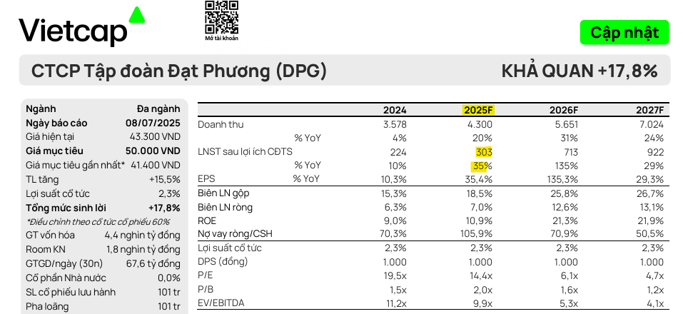 Công ty Chứng khoán Vietcap (VCSC, ngày 8.7.2024)) đã điều chỉnh tăng giá mục tiêu của DPG thêm 21% lên 50,000 đồng/cổ phiếu, tuy nhiên lại hạ khuyến nghị từ MUA xuống KHẢ QUAN.