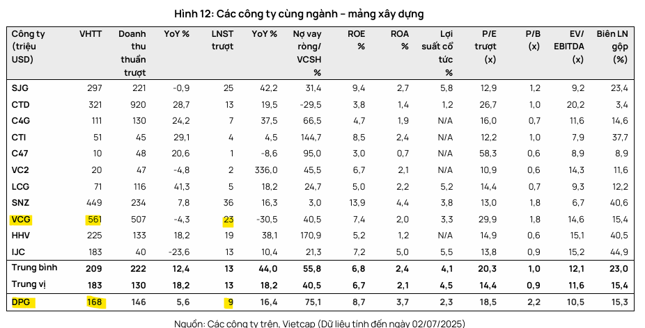 Vietcap nhận thấy trong quá khứ, các công ty cùng ngành xây dựng hạ tầng thường được giao dịch với mức định giá cao hơn DPG. Tuy nhiên, Vietcap cho rằng điều này là do quy mô nhỏ hơn của DPG, mặc dù biên lợi nhuận gộp của DPG tương đương mức trung vị của ngành và ROE còn cao hơn.
