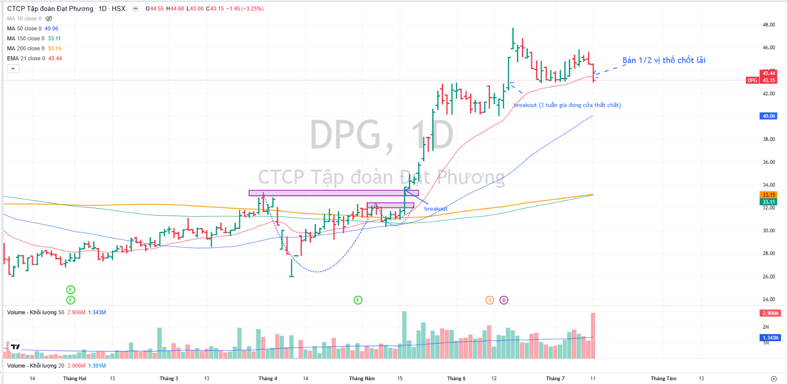 Ngày 11.7.2025, DPG giảm -1.3% với thanh khoản lớn và là phiên đầu tiên đóng cửa dưới EMA 21 ngày. Các nhà giao dịch được khuyến nghị nên bán bớt 1/2 vị thế cổ phiếu để khoá lợi nhuận. Phần vị thế còn lại tiếp tục trailing stop theo MA50 ngày.