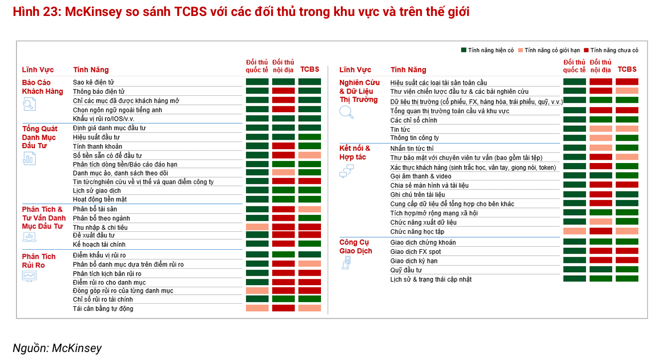 Theo đánh giá của McKinsey, thể hiện qua biểu đồ năng lực sản phẩm, TCBS đã vượt xa phần lớn các công ty chứng khoán nội địa và tiệm cận gần nhất với nhóm các tổ chức tài chính toàn cầu