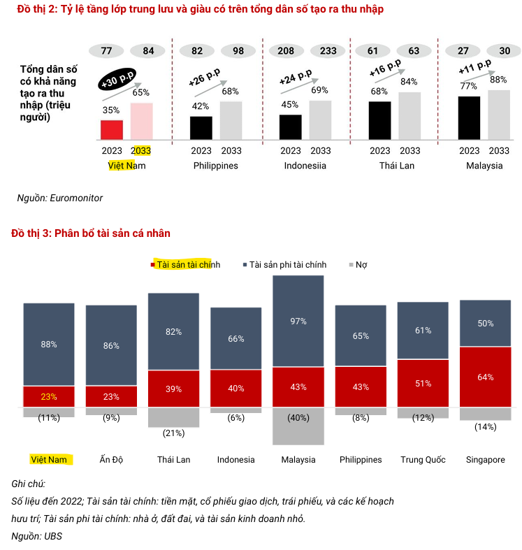 Việt Nam đang chứng kiến sự gia tăng mạnh mẽ của tầng lớp trung lưu và giàu có, dự kiến tỷ lệ dân số thuộc nhóm thu nhập trung bình và cao có thể tăng từ 35% năm 2023 lên 65% vào năm 2033. Cùng với đó, hành vi phân bổ tài sản của người Việt cũng đang có xu hướng dịch chuyển từ tài sản vật chất sang tài sản tài chính. Tỷ lệ tài sản tài chính trong tổng tài sản cá nhân tại Việt Nam hiện chỉ ở mức 23%, thấp hơn đáng kể so với Singapore (64%) và Trung Quốc (51%), cho thấy dư địa lớn cho sự phát triển của các dịch vụ đầu tư và quản lý tài sản.